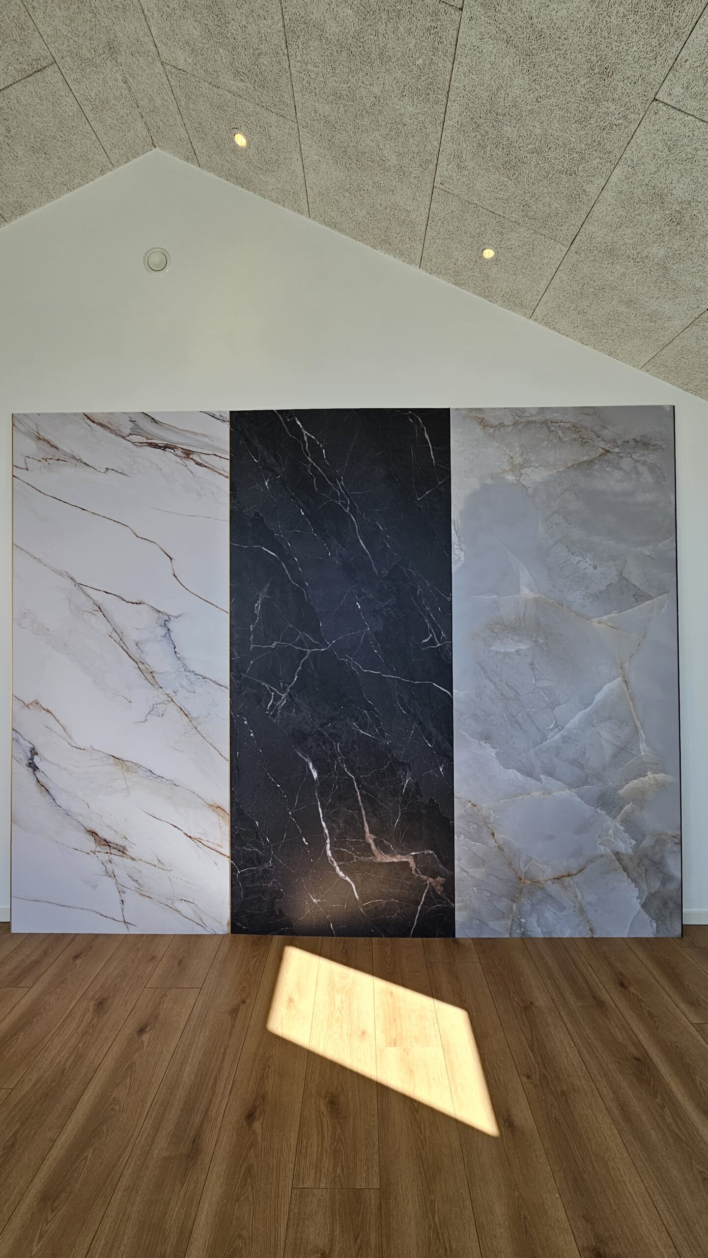Stone Panels – elegant vægdesign med marmoreffekt og 3D-struktur i slidstærke, vandafvisende bambusfibre.